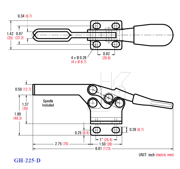 Cam kẹp ngang GH225D được sử dụng trong công nghiệp để gá kẹp nhanh sản phẩm, kẹp kiểu ngang nghĩa là ở trạng thái giữ sản phẩm thì tay cầm của kẹp song song với bề mặt sản phẩm kẹp.